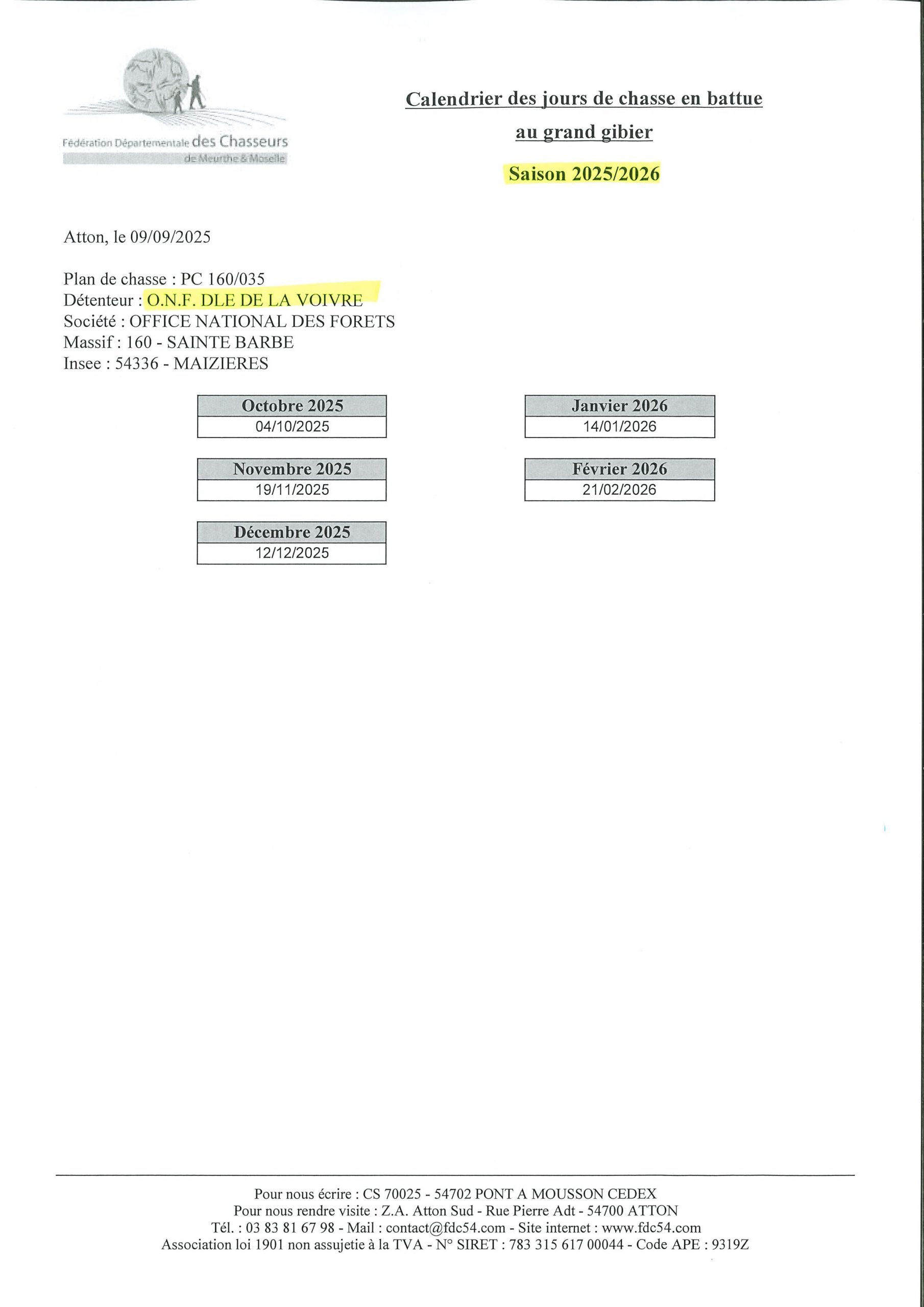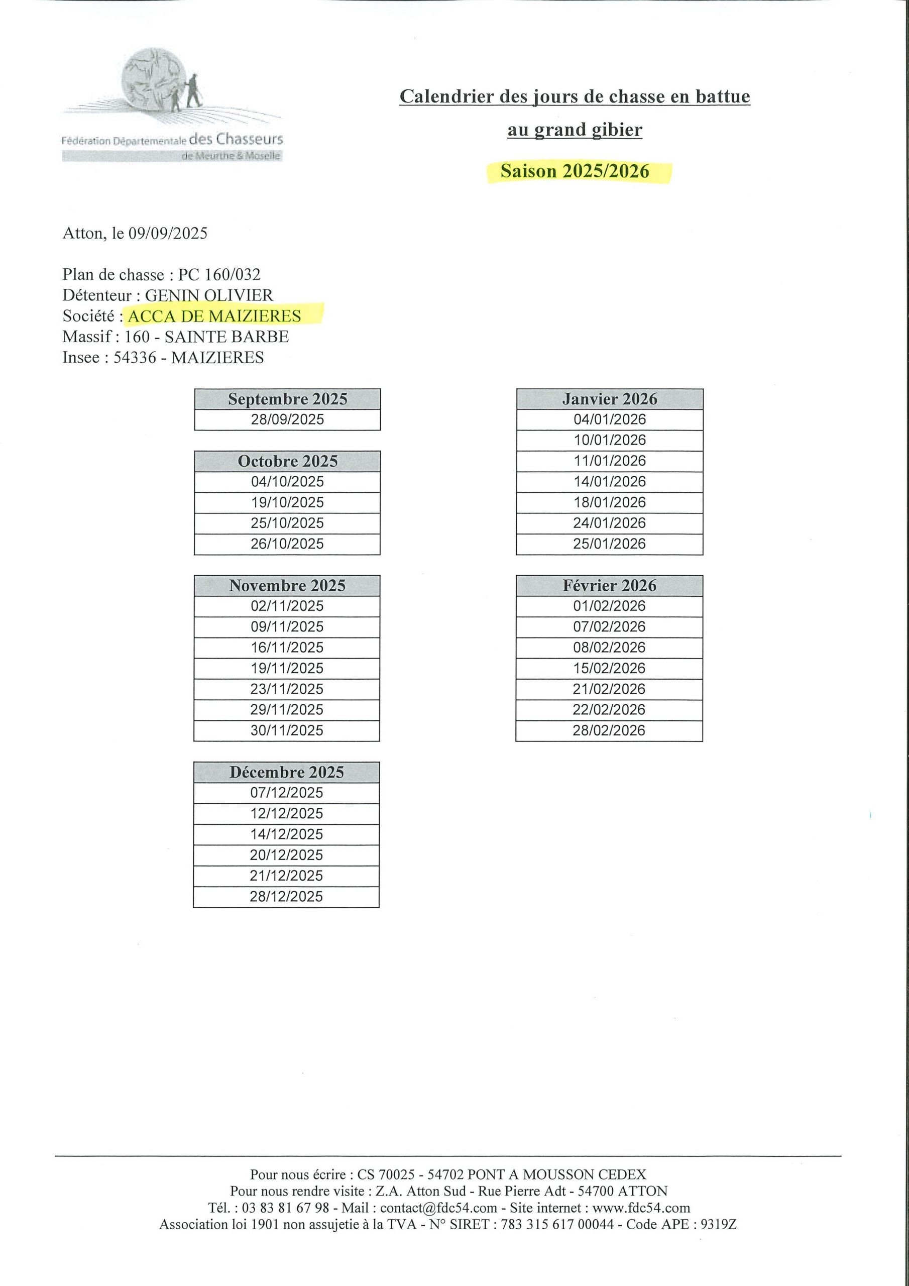 Pour consulter les calendriers de chasse par commune : www.fdc54.com/saisie-en-ligne/calendriers/