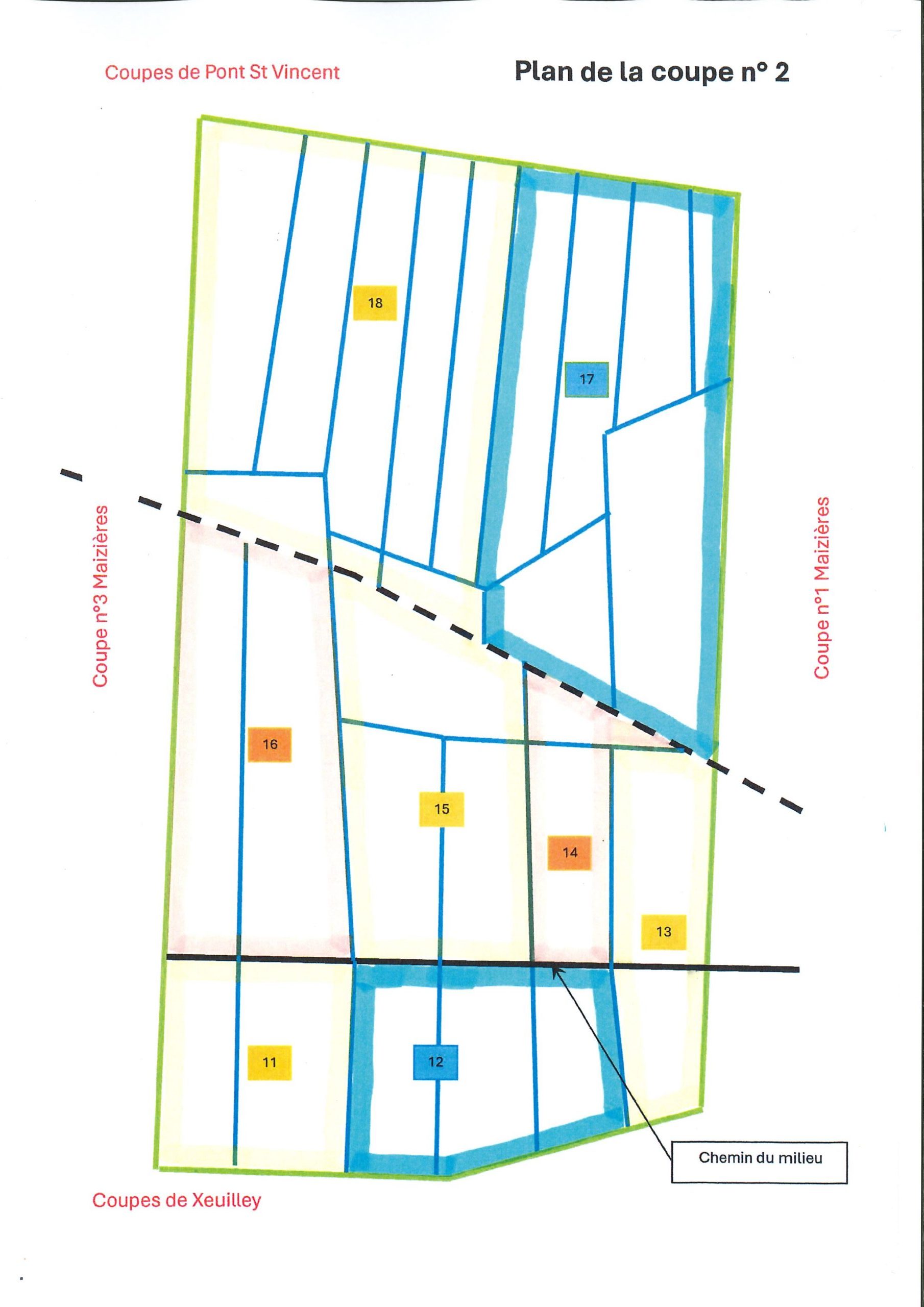 Nous exploitons les coupes 5-6-8-12 et houppiers de bois victimes de la sécheresse coupes 3-4-5, vous trouverez le plan des lots (après lotissement suite à l’abattage par le bucheron), les coupes se trouvent entre le plateau Sainte Barbe et la route des Gimées.
